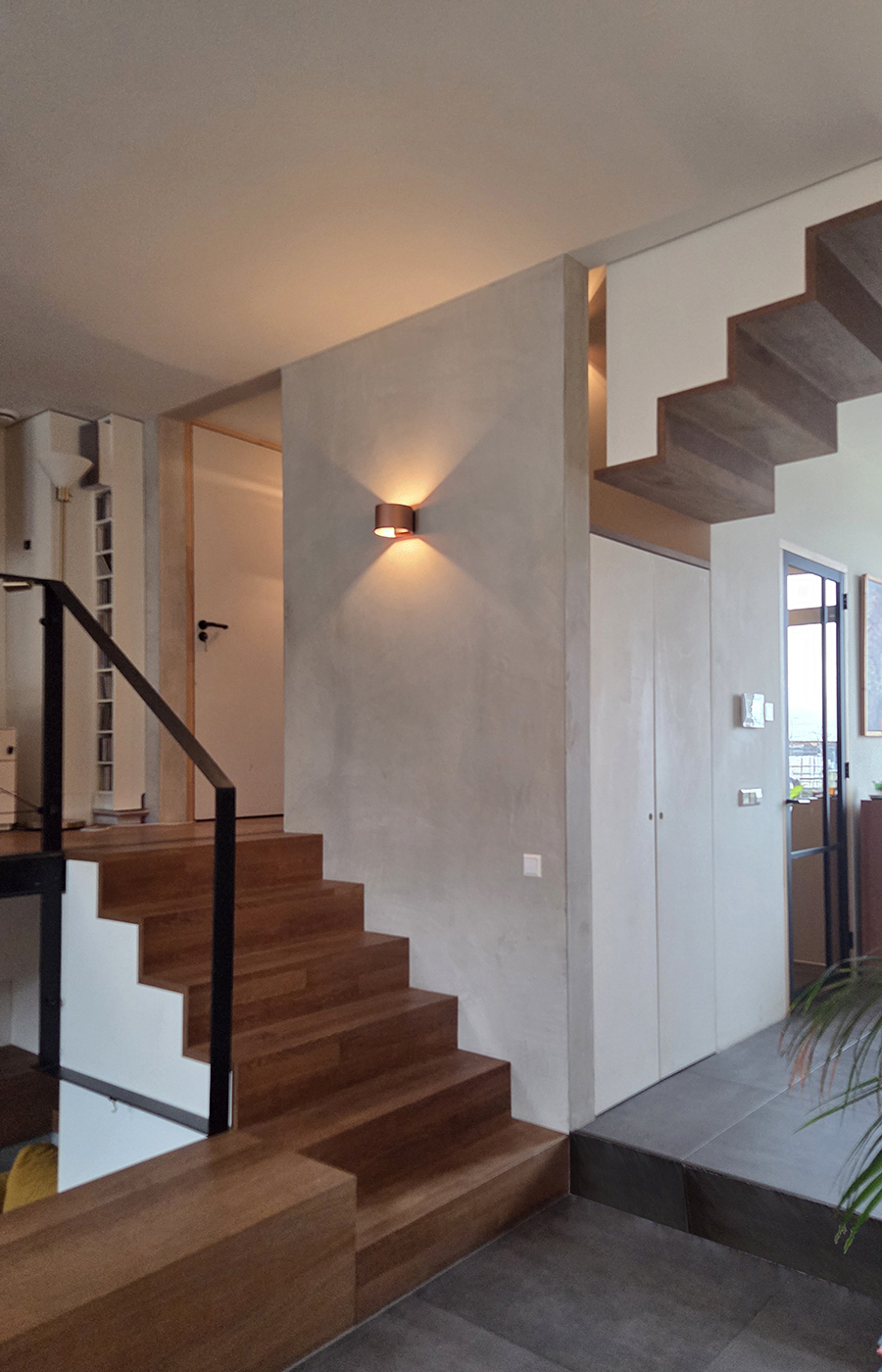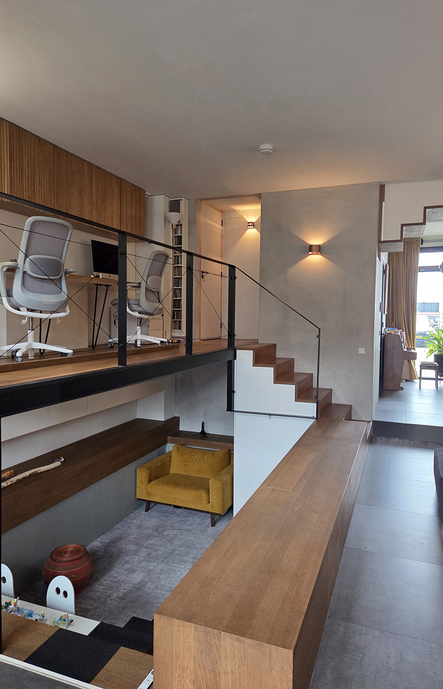 Duurzaam betekent voor ons niet alleen een laag energieverbruik, fossielvrij, en ruimte bieden aan water, flora en fauna. Voor ons is het ook essentieel dat het bouwwerk mee kan groeien met mogelijke veranderingen in ons leven. En dat biedt dit huis ons: het is toekomstbestendig. Met de derde laag kunnen we alle kanten op. Het wordt een werkplek voor ons beginnend videobedrijfje, maar zo ontworpen dat het ook een tijdelijk thuis kan zijn voor onze op leeftijd rakende ouders, een ruimte voor onze studerende kinderen later, of voor wat de toekomst ons ook brengt. Deze flexruimte maakt het mogelijk om onze verbondenheid met anderen op verschillende manieren in te vullen.